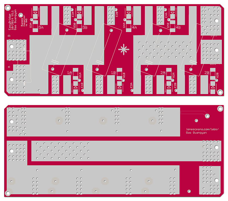 The EasyBridge is an easy-to-use dual-H-bridge inverter system which I designed when building my QCW Tesla Coil. I originally designed the EasyBridge system as a tidy way to build paralleled H-bridges using TO-247 transistors. It is of a compact design and has the main feature of having large pads instead of through-holes for soldering the legs of TO-247 packages.